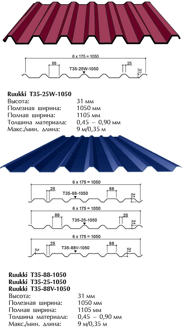 Поофнастил Ruukki T-35 надёжный вид профиля для кровли. Отличной подойдёт для выполнения быстро возводимых зданий, где профиль Т35 будет выполнять функцию не только отделочного материала, но и возьмёт на себя часть несущих нагрузок. Благодаря достаточно высокой волне профнастил Т-35 можно смело использовать в виде кровельного материала с небольшим уклоном ската крыши.